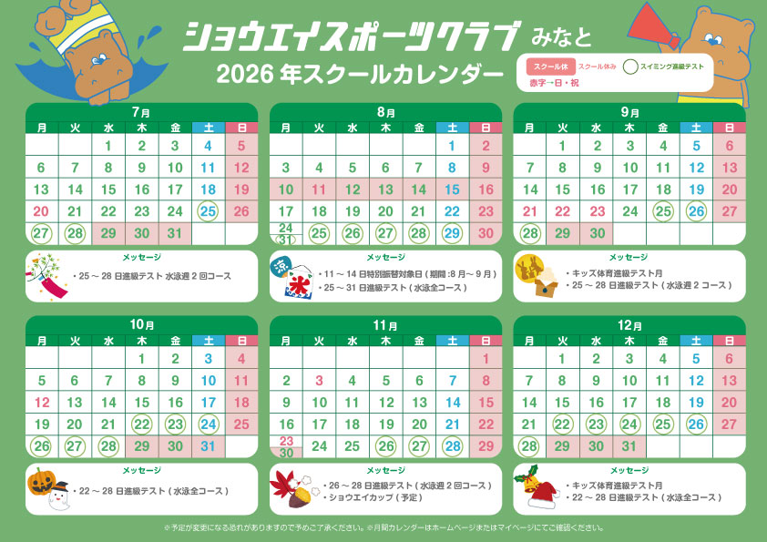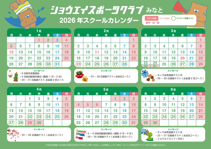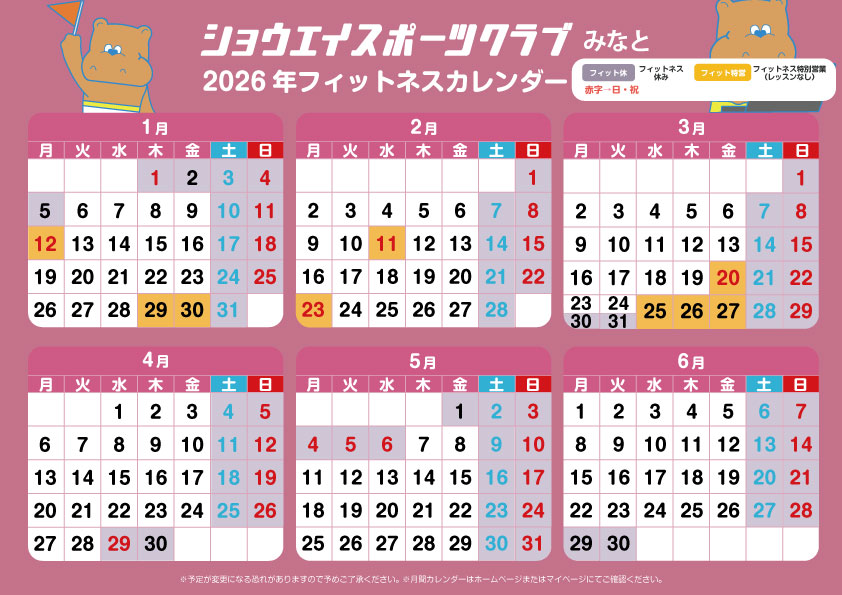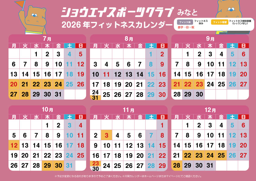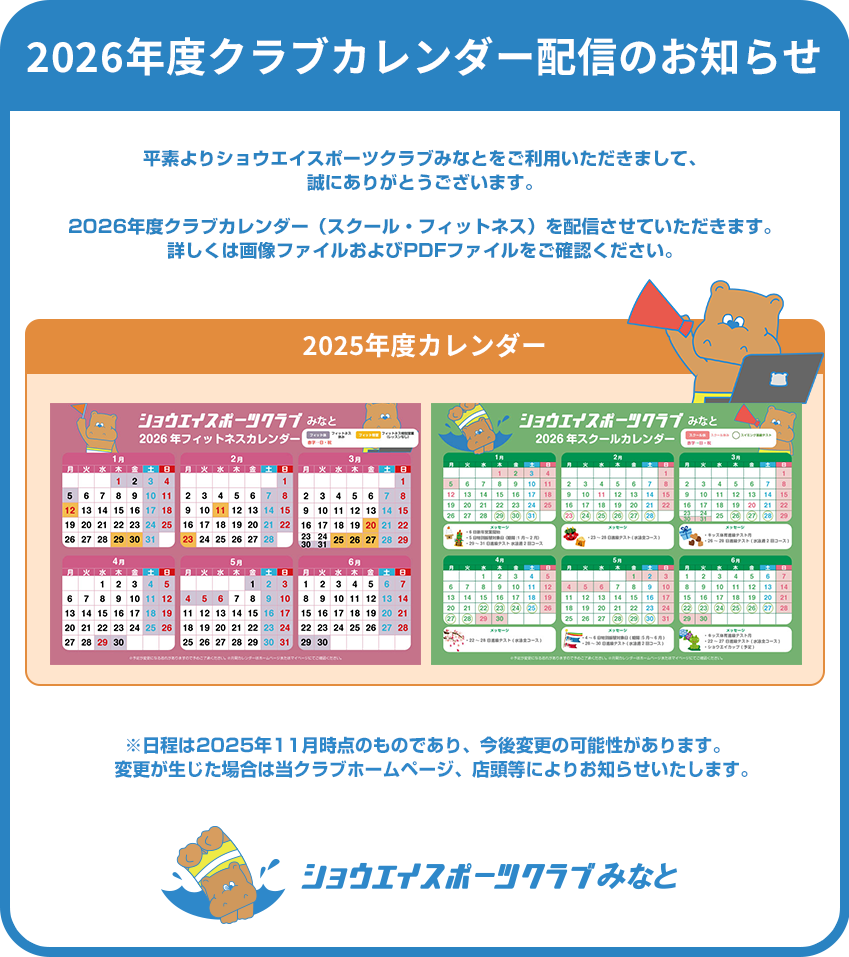 2026年度クラブカレンダー配信 お問い合わせ お電話またはフォームから気軽にお問い合わせください。 06-6571-3344 受付時間/ 平日・祝日 10:00~20:00 土曜・5週目 9:00~17:00 日曜・月末・季節休暇 休館 入会・施設見学ご希望の方